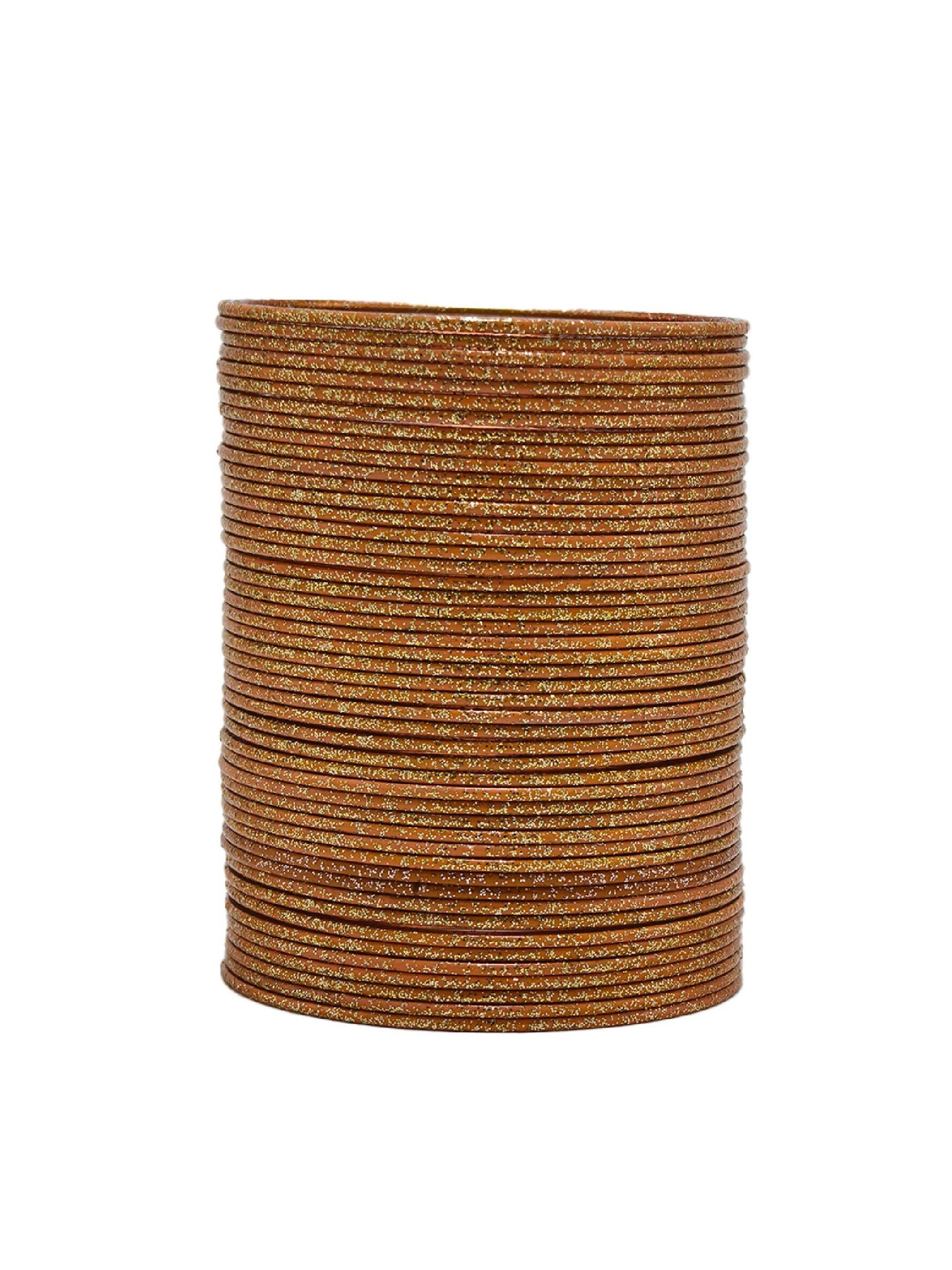 This eye-catching bangle set is designed to add brilliant sparkle and radiant elegance to any outfit. The set consists of 48 Shimmery metallic bangles, each featuring a captivating glitter texture that shimmers beautifully in the light. The uniform design allows them to be worn as a full, voluminous stack or paired with other accessories for a layered style. Perfect for festive occasions, parties, and celebrations, this extensive set brings glamour and charm to both traditional and contemporary ensembles.
