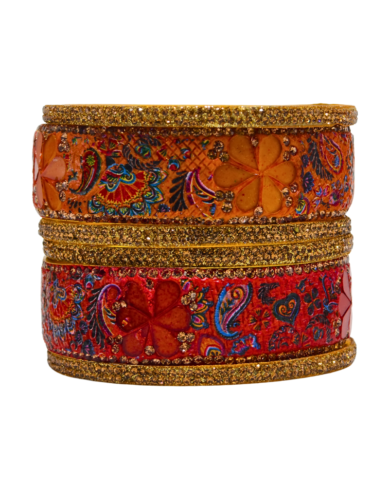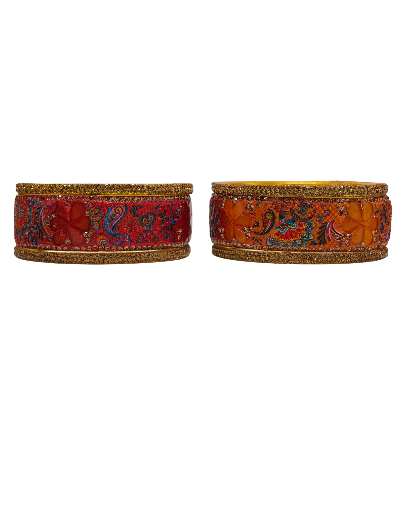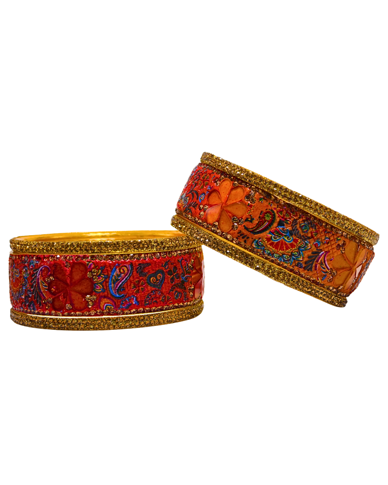 This is a 2-Hand Bangle Set featuring 2 broad metal bangles with vibrant Dual Color enamel, floral motifs, and golden detailing.