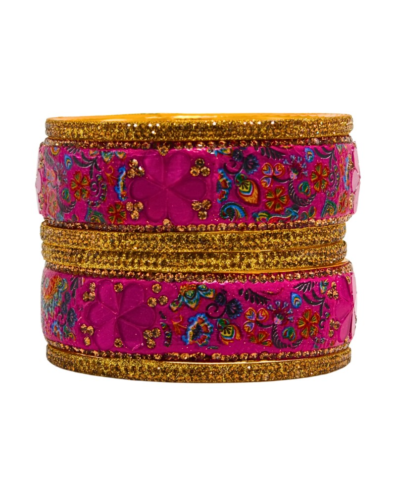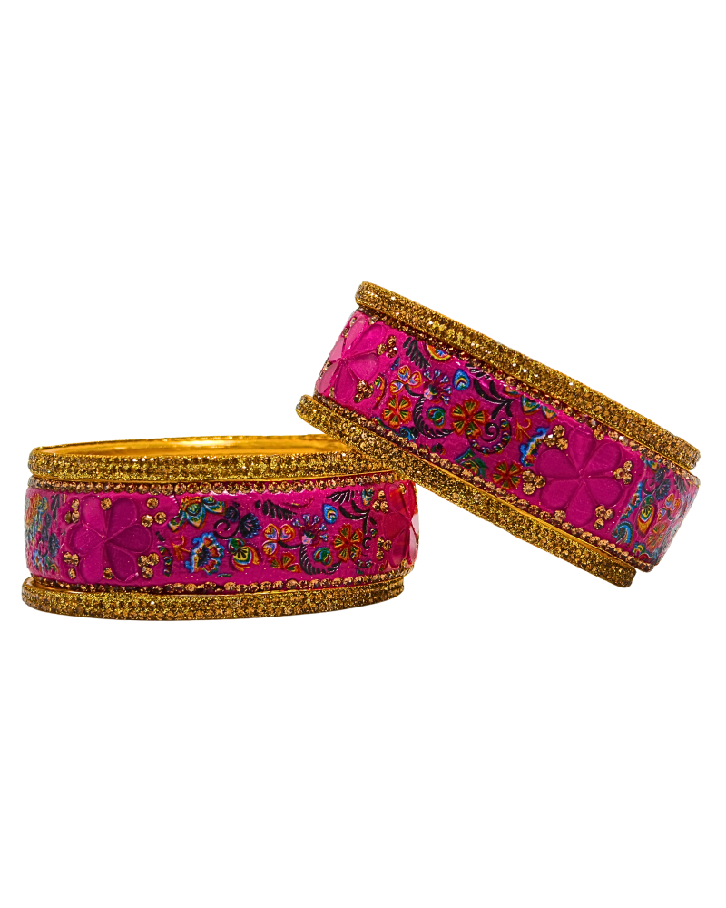This is a 2-Hand Bangle Set featuring 2 broad metal bangles with vibrant pink enamel, floral motifs, and golden detailing.
