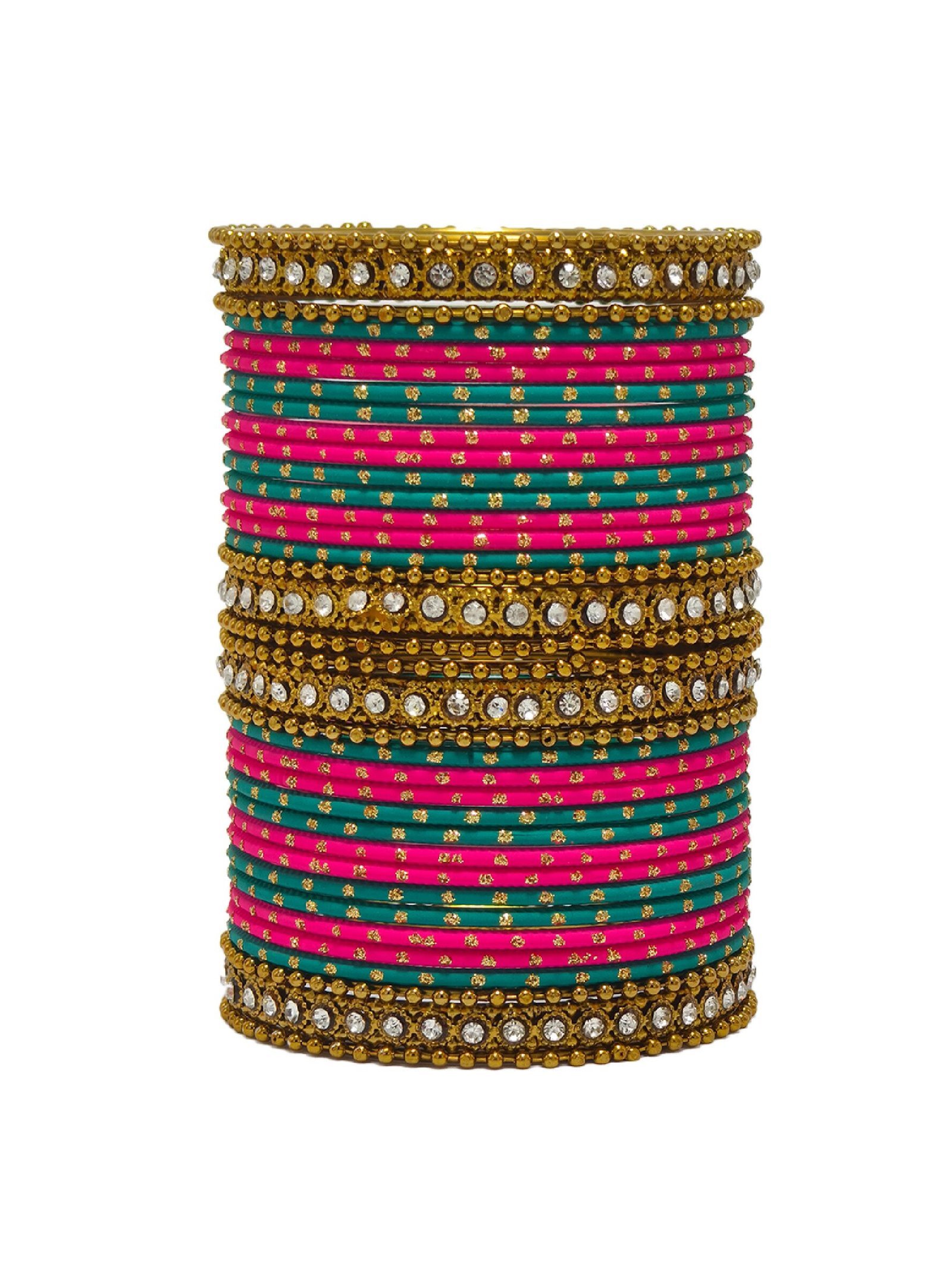This exquisite 36-piece bangle set blends subtle elegance with bold detailing, making it a must-have for festive and special occasions. The set features 24 Beads finish metallic bangles with delicate dotted designs that add texture and charm, 8 golden metallic bangles that bring a warm traditional glow, and 4 broad golden bangles adorned with sparkling white stones for a statement finish. The combination of intricate patterns, golden shine, and stone-studded glamour makes this set perfect for weddings, parties, and festive celebrations, ensuring you shine with every move.
