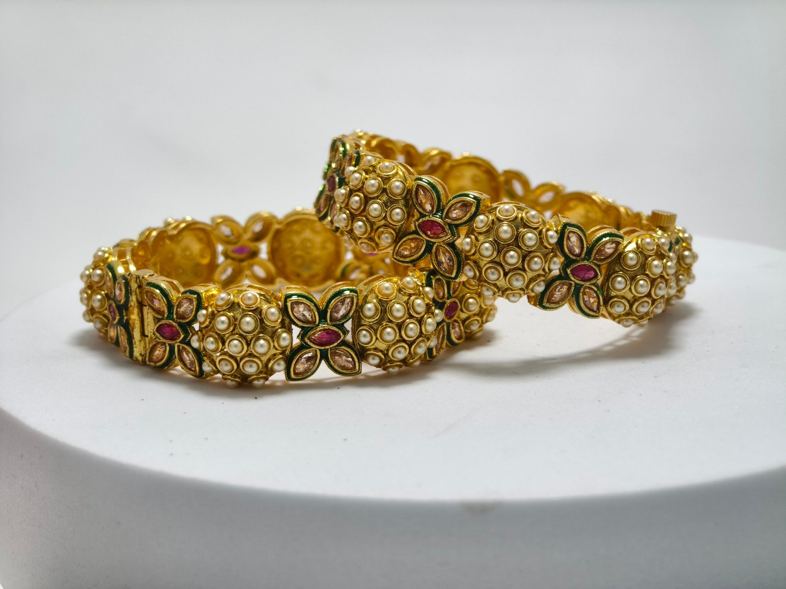 Every piece is exclusively made-to-order, ensuring individuality and unmatched craftsmanship. Unlike ordinary bangles, this premium design undergoes a labor-intensive process of hand-setting stones, embedding pearls, and finishing with intricate detailing—an art form that demands patience and perfection.